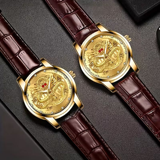 تألّق بإطلالة فاخرة مع ساعة الرجال الذهبية المزينة بتصميم التنين المميز، حيث يجتمع الفن مع الأناقة في قطعة واحدة. تتميّز هذه الساعة بتفاصيل دقيقة تمنحها طابعًا قويًا وجريئًا، بينما يضفي اللون الذهبي اللامع لمسة فخامة تلفت الأنظار في كل مناسبة.